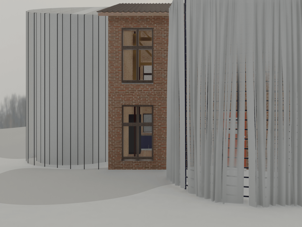 I kollektivhuset Snickeriet står tiden aldrig stilla. Gemenskapen står i fokus när byggnaden expanderar vertikalt. Verkstaden har dubbel takhöjd men gör sedan plats för fler sovrum på nästa våning. Visualisering av våning två under konstruktion. Axonometrin visar husets expansion i flera faser. Fas 1 visas som renderat med färg och materialitet. Fas 2 visas även den som renderat men under konstruktion, se t ex tegelstenar och grå isolering på våning 2. Fas 3 visas som linjeritningar och är det som inte byggts än.
