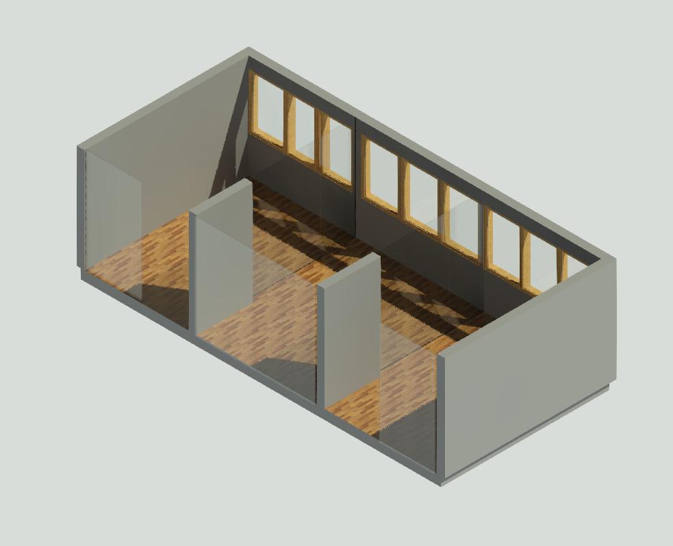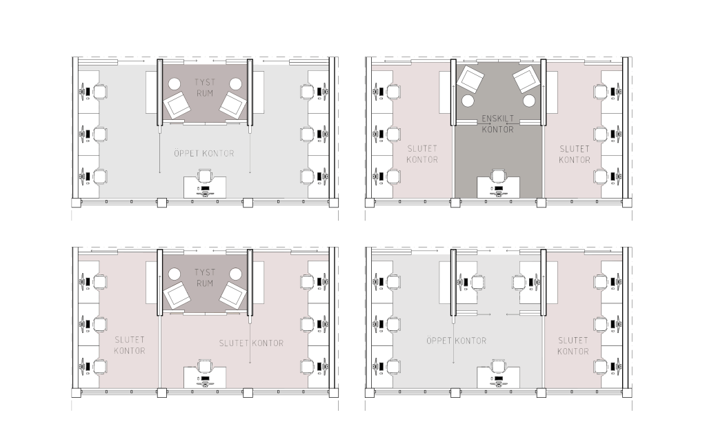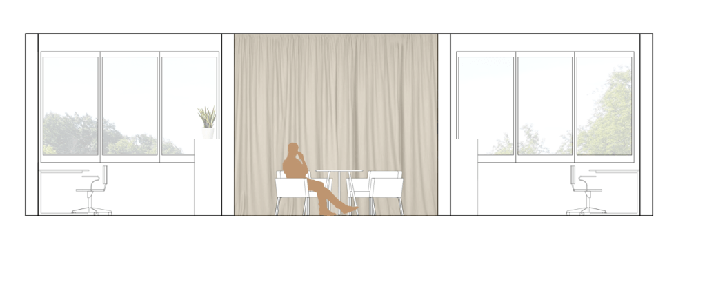 Utsnitt plan och sektion över modul där de olika möjligheterna att skärma av visas