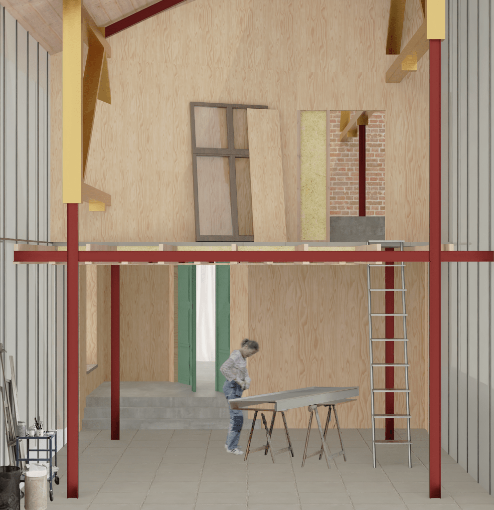 I kollektivhuset Snickeriet står tiden aldrig stilla. Gemenskapen står i fokus när byggnaden expanderar vertikalt. Verkstaden har dubbel takhöjd men gör sedan plats för fler sovrum på nästa våning. Visualisering av våning två under konstruktion. Axonometrin visar husets expansion i flera faser. Fas 1 visas som renderat med färg och materialitet. Fas 2 visas även den som renderat men under konstruktion, se t ex tegelstenar och grå isolering på våning 2. Fas 3 visas som linjeritningar och är det som inte byggts än.