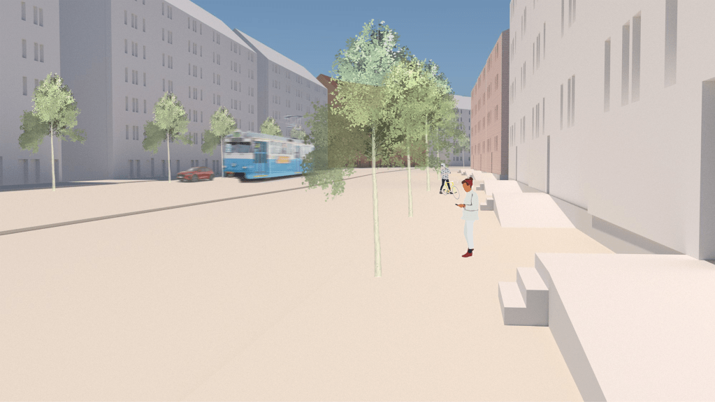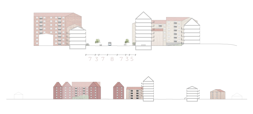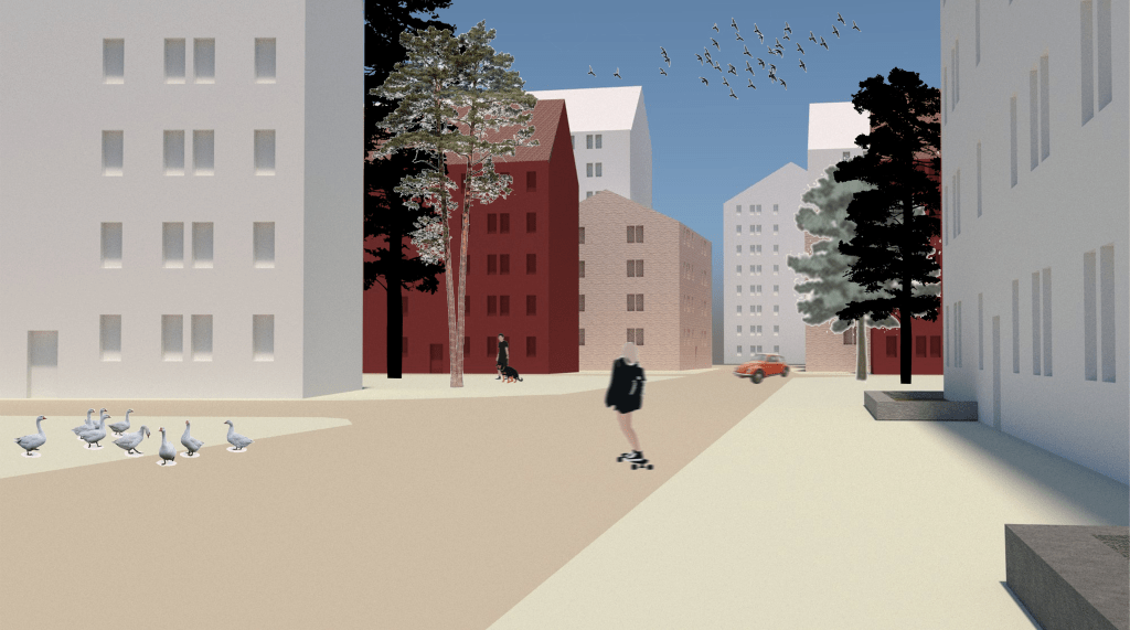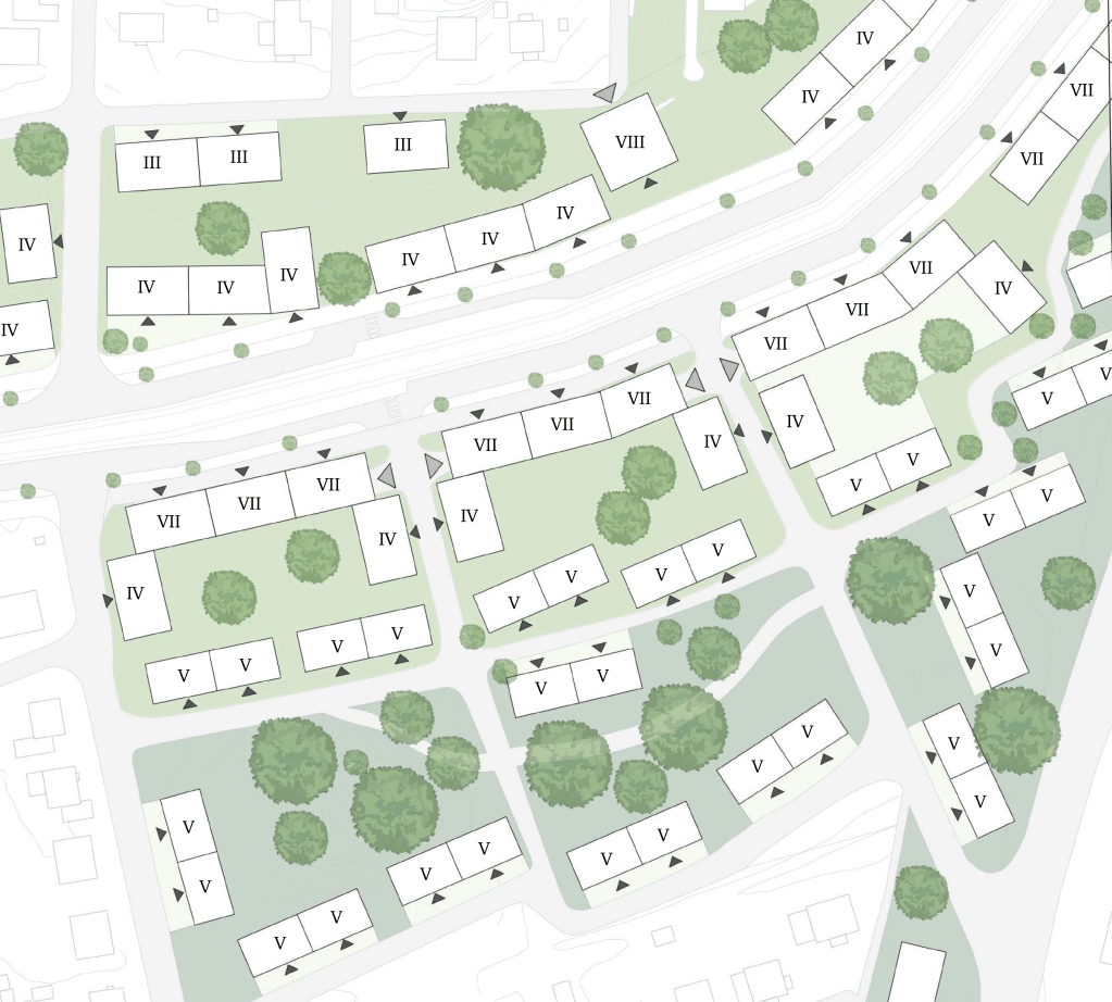 Stadsplanen Kyrkbyns tallar består av varierade typologier och stadsrum. Många byggnader är i 3-4 våningar för att möta befintliga bebyggelse. Den stadsmässiga boulevarden kantas av lamellhus i 7 våningar. I södra området tas grönområden tillvara och de smala lamellhusen om 5 våningar är lagda runt mjuka gator och planterade tallar.