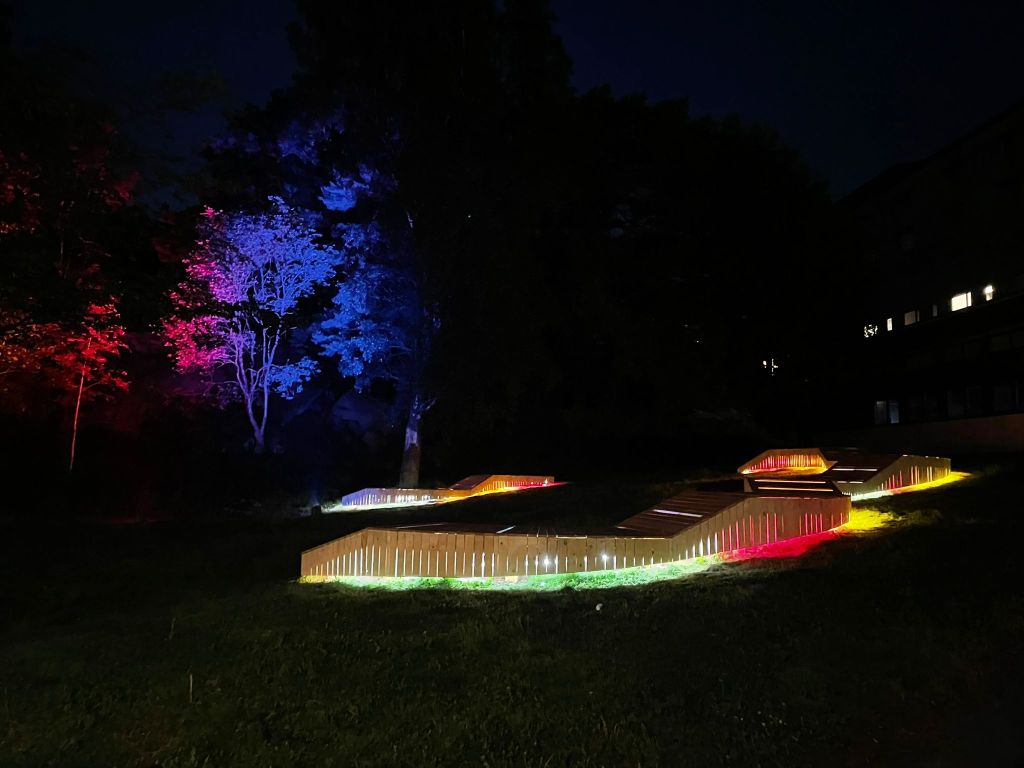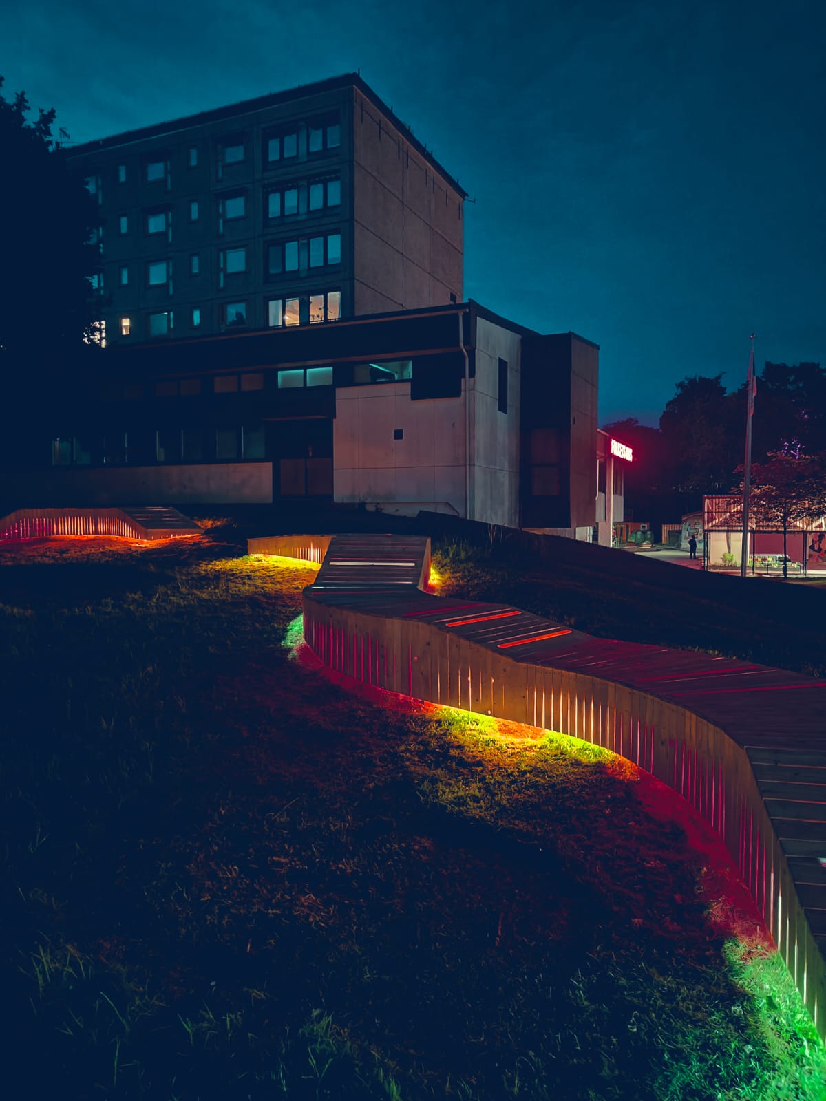 Bostadsbolaget och Göteborgs stad upplät mark vilket bland annat resulterade i en lekfull sittmöbel längs med grässluttningen nedanför Folkets Hus i Hammarkullen. Projektet är starkt sammankopplade med färg och ljus och stod klart i maj 2024. Foton av Nithin Jacob.