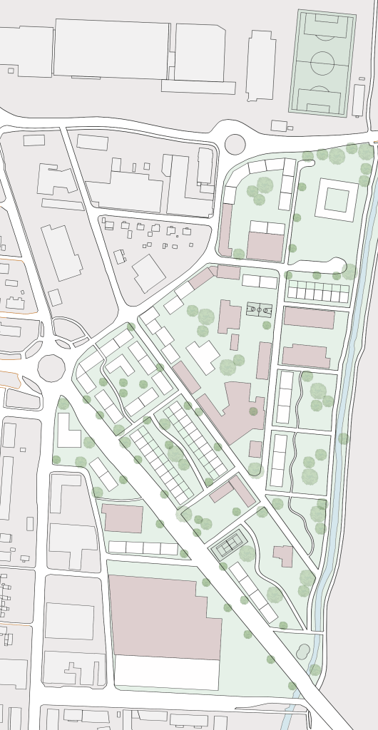Föreningsliv och publika zoner som används idag är viktiga för områdets sociala arv och får stå kvar. De bevarade byggnaderna markeras i ritningen till höger. Blandningen av äldre och nybyggt skapar en spännande variation som ger en livfull stadsdel med karaktär och känsla.