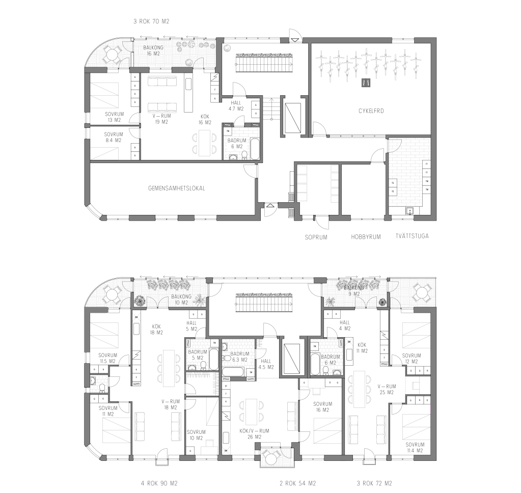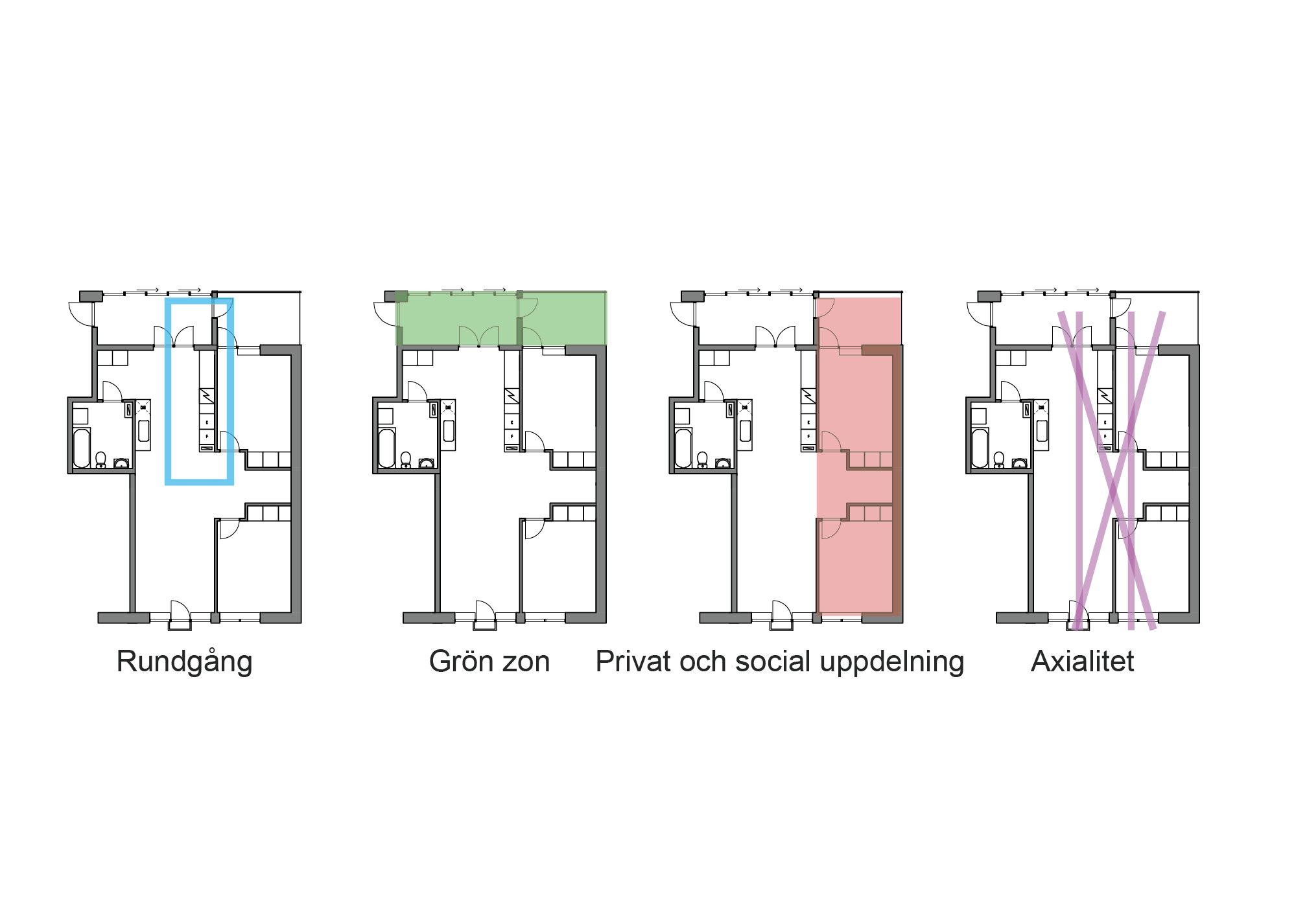 Stora lägenheter med villakvaliteter för att göra lägenheten attraktiv även för familjer som vill bo kvar länge. Inspiration kom tidigt från Urbana Villor med stora odlingsbalkonger som även fungerar som entré. Gränsen mellan ute och inne suddas ut. Den ljusa trappan blev ett centralt koncept. De rundade hörnen vid gatan skapar bättre genomsikt i stadsrummet.